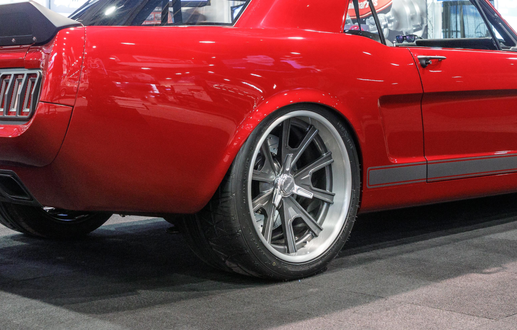 BASF Automotive Refinishing Coatings custom candy based on Ford “Liquid Red”, Ringbrothers Widebody carbon fiber doors, fenders and hood, custom carbon fiber front lower valance, splitter, trunk and spoiler